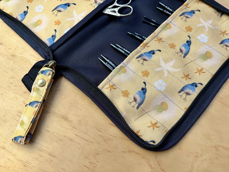 Por dentro, trae tres compartimentos grandes para los cables y siete espacios independientes para tus palillos circulares, todo a la vista y sin que nada se mezcle. Además, incluye un bolsillo interior donde puedes guardar marcadores, una tijerita, crochet o cualquier tesoro pequeño que siempre anda dando vueltas.